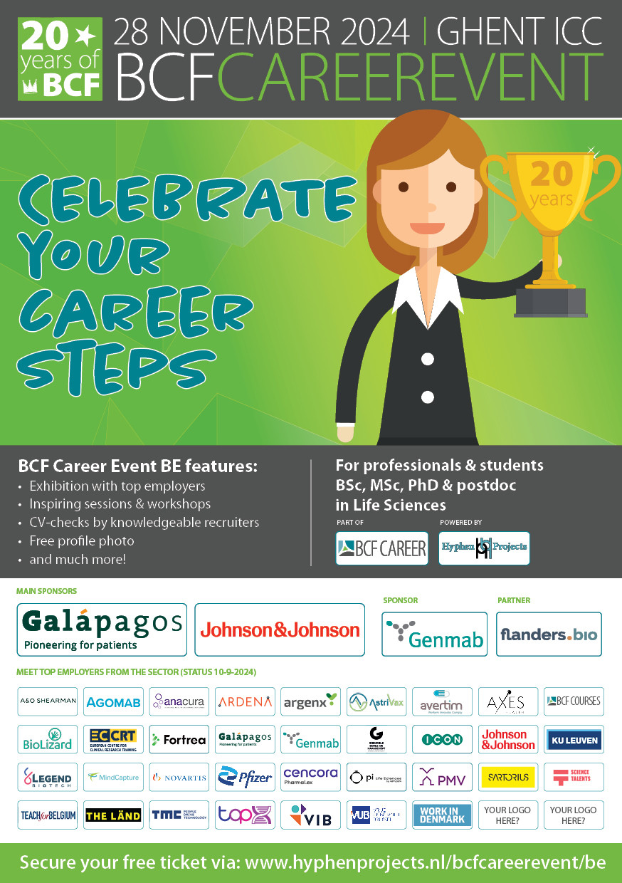 To attract (BSc, MSc, and PhD) students, postdocs and (young) professionals to your organisation, BCF organizes the BCF Career Event Belgium which take place on 28 November in Ghent ICC. You can meet approx. 1,000 candidates and clients. Get inspired by this short after movie to see how vibrant the event is!
