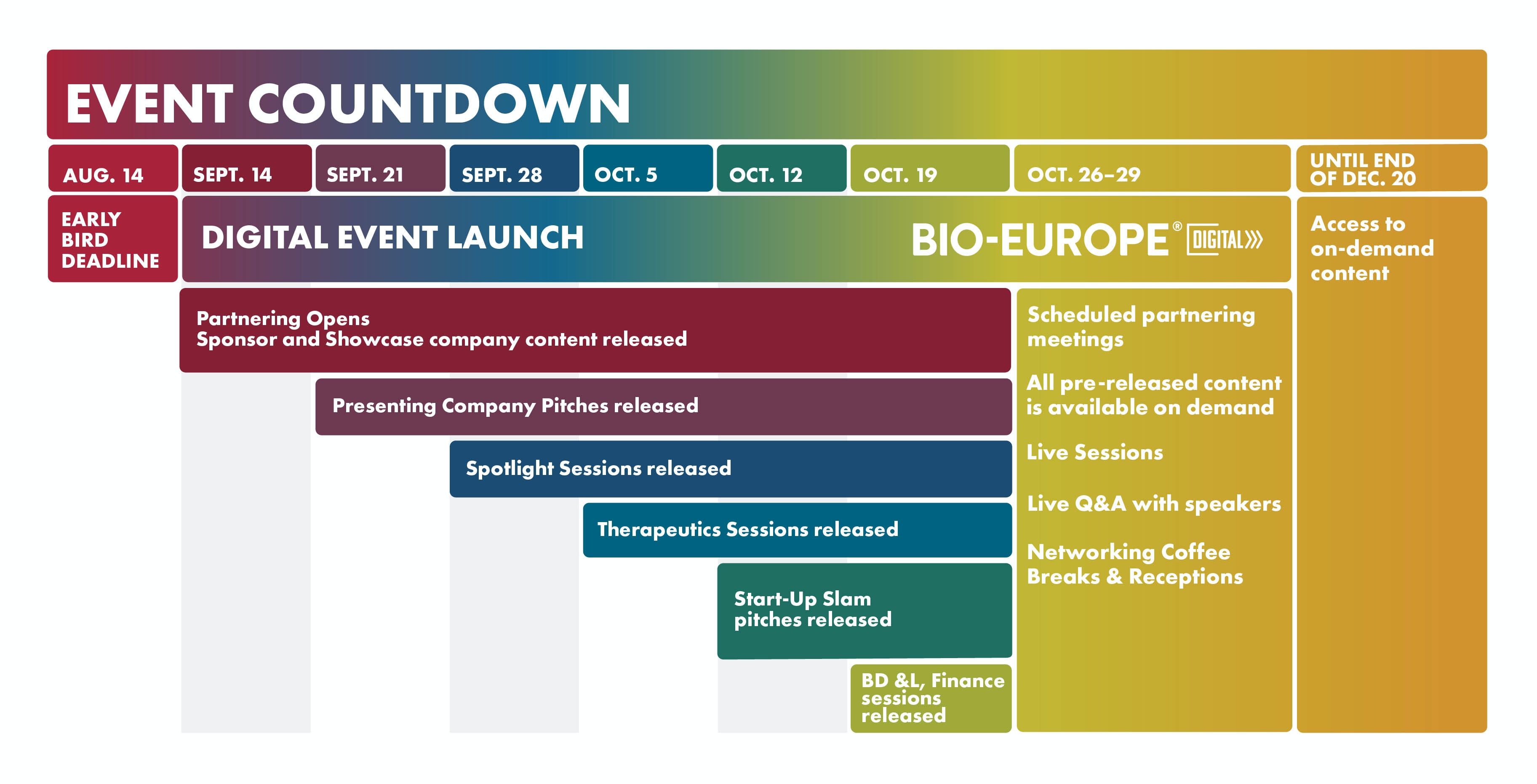 Sponsor and Showcase Company content will be ready to watch four weeks ahead of the conference, and you’ll be able to tune in on demand to panels on BD&L, Finance, Therapeutic Areas and up-to-the-minute Spotlight topics released weekly up until BIO-Europe officially opens.