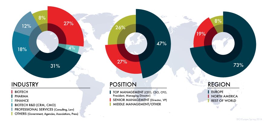 BIO-Europe Spring attracts a wide range of business leaders, including senior executives of leading biotech companies, business development teams from large and midsize pharmaceutical companies, investors and other industry experts.