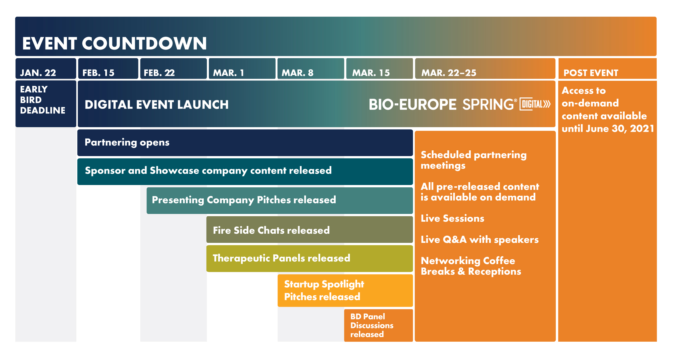 BIO-Europe Spring Digital 2021 is expected to bring together over 2,500 executives from biotechnology, pharmaceutical and finance companies from around the world, who will engage in more than 15,000 partnering meetings.