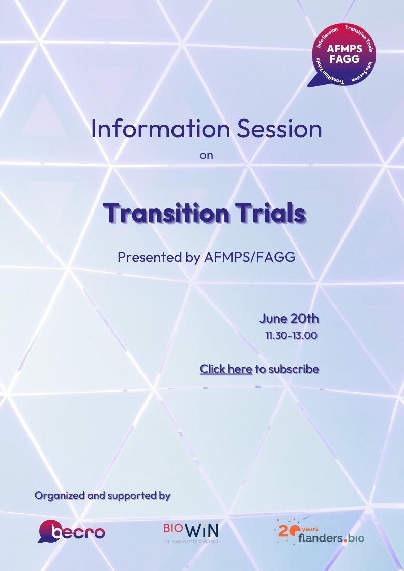 Back to all events Datum 20 June 2024 13:30–15:00 Event type News labels / tags Other View more info Webinar: Information session on Transition Trials Register here Register now for this information session given by AFMPS/FAGG June 20th, 11.30-13h. Register here