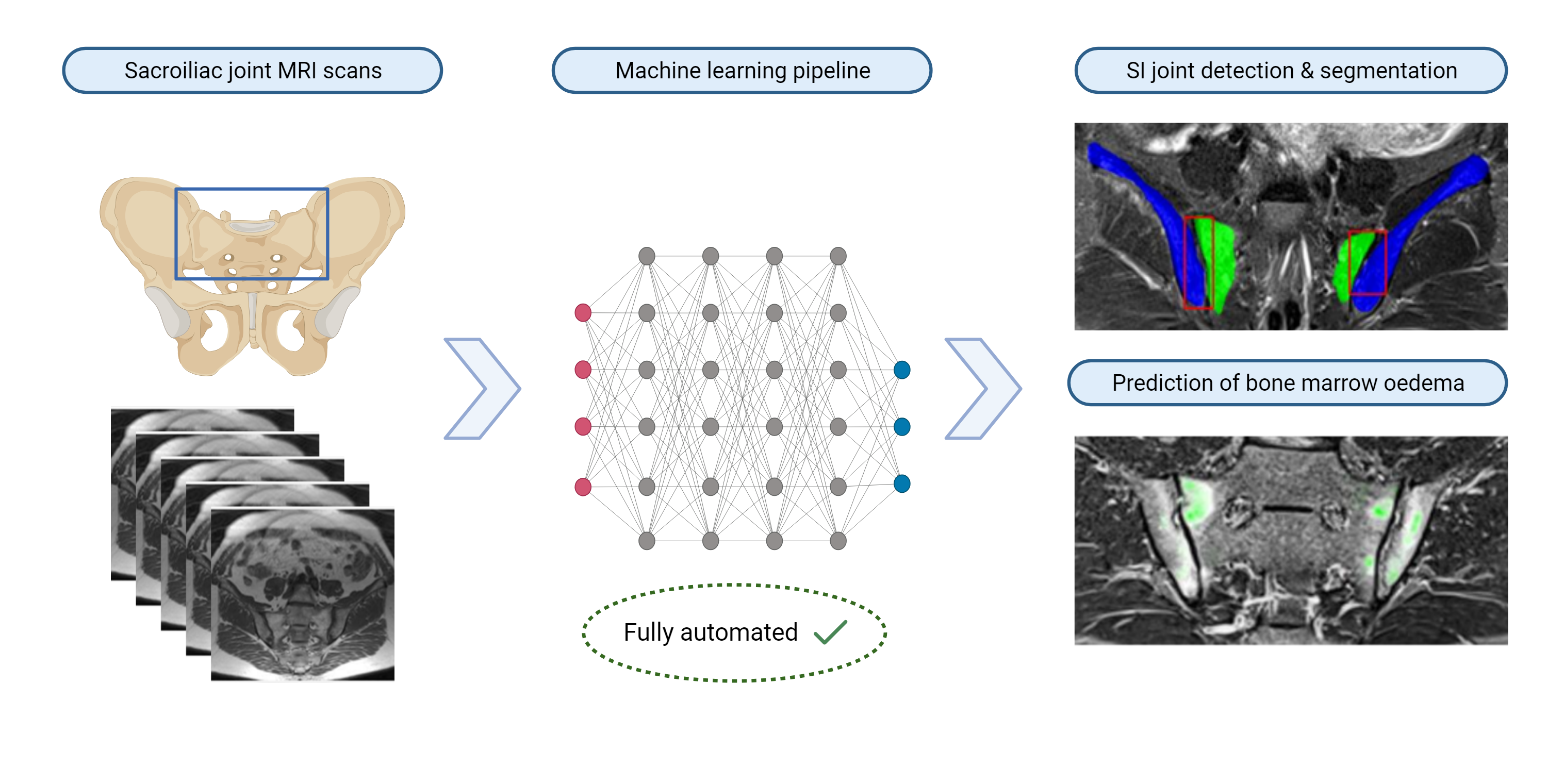 A machine learning pipeline for predicting bone marrow oedema along the sacroiliac joints on magnetic resonance imaging. Roels, De Craemer, et al. Arthritis & Rheumatology. 2023.