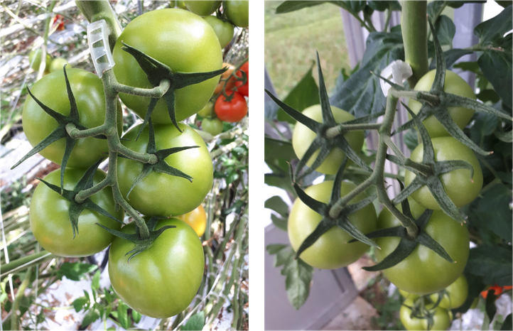 De tomaten links zijn normaal gevormd. Bij de tomaten rechts stammen de oudste exemplaren (dichts bij de steel) uit defecte voortplantingscellen. Zij zijn beduidend kleiner dan de later gevormde exemplaren.